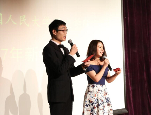 18时整,由校国标队张萌、邓婷文、汪俊妍、冯雨带来的精彩的拉丁舞正式拉开了晚会的序幕。2016级硕士生李凯华和2014级本科生孔荦主持晚会。随后,主持人邀请黄兴涛院长上台致辞,他对2016年师生们为学院发展所做出的贡献和付出表示感谢,认为新的一年意味着新的希望、新的起点和新的挑战,勉励同学们在2017年继续努力、学业有成,希望各位借助晚会师生同乐,辞旧迎新,并预祝大家新年顺遂,身体健康,万事如意!