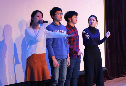 陈国鹏、栾文韬、董津汁、罗美多倾情献唱《小酒窝》,欢快的曲调与本科生同学的青春活泼相得益彰,赢得全场掌声雷动。